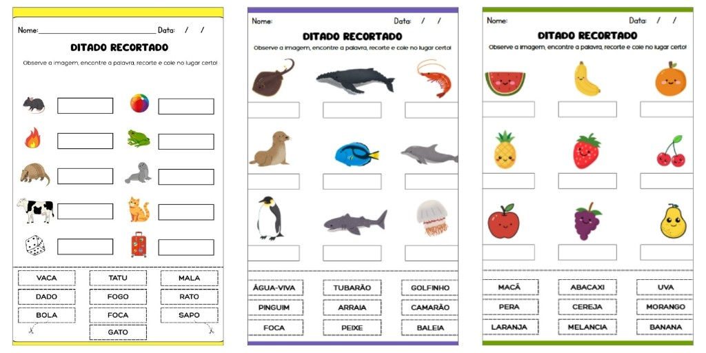 O ditado recortado serve para desenvolver a relação entre som e letra de forma concreta e visual. Ele ajuda a criança a perceber a ordem das letras, a quantidade de sílabas e a estrutura das palavras. Além disso, contribui para a ampliação do vocabulário, fortalece a leitura e prepara o aluno para o ditado escrito tradicional. Por não exigir tanta coordenação motora, a atividade reduz a frustração e aumenta a confiança da criança, favorecendo avanços consistentes na alfabetização.